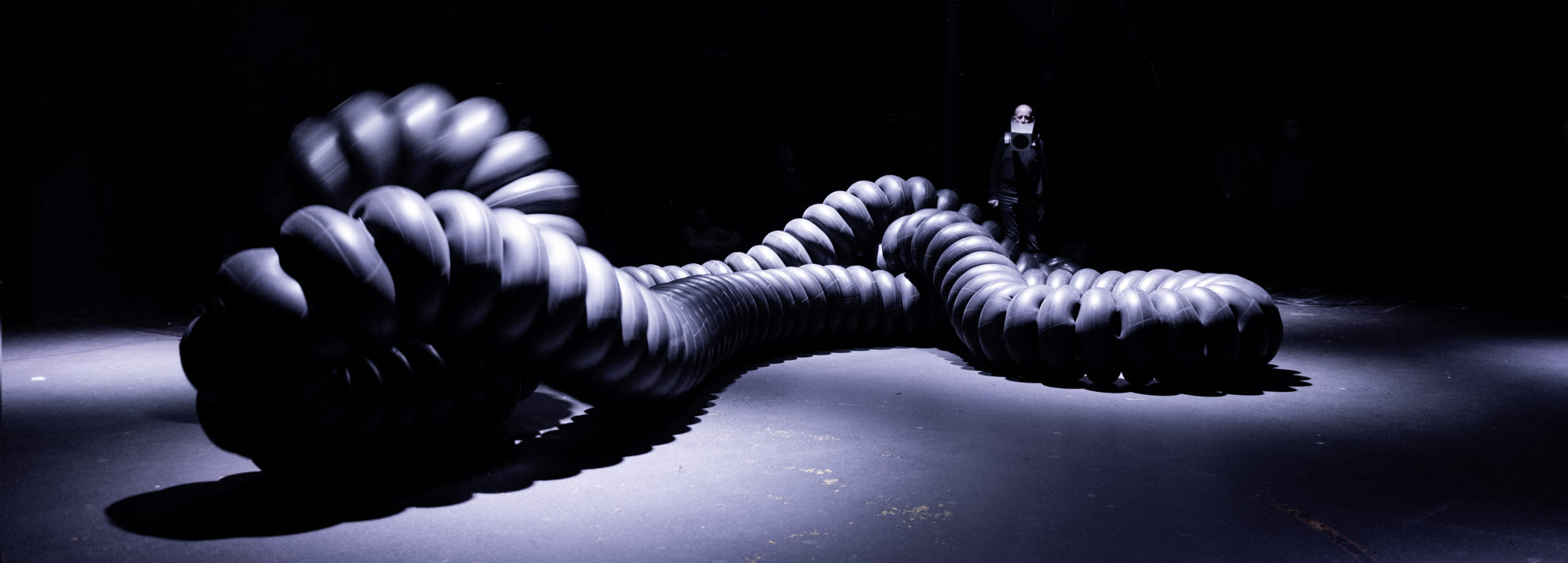 πTon ist eine Klanginstallation. Eine lange Gummiröhre, die in einer Schleife geschlossen ist, wird durch Verrenkungen und Wellenbewegungen wie ein wirbelloser Körper animiert. Umgeben von einer Gruppe von vier stummen Menschen, die mit seltsamen Stimmprothesen ausgestattet sind, scheint die Kreatur sich vergeblich von dieser störenden Gegenwart lösen zu wollen. Ihre Bemühungen erregen die Neugier der vier Menschen und werden zum Gegenstand hochentwickelter polyphoner Rituale, die nur aus synthetisierten Stimmen bestehen.